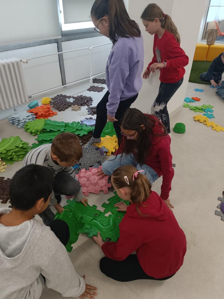 Děti tvořily z ortopedických podložek, které pomáhají rozvíjet správnou chůzi, posilují střed těla a působí jako prevence plochých nohou, originální cestičky. Těmito cestičkami si propojily stanoviště, na kterých plnily ve skupinách různé úkoly.
