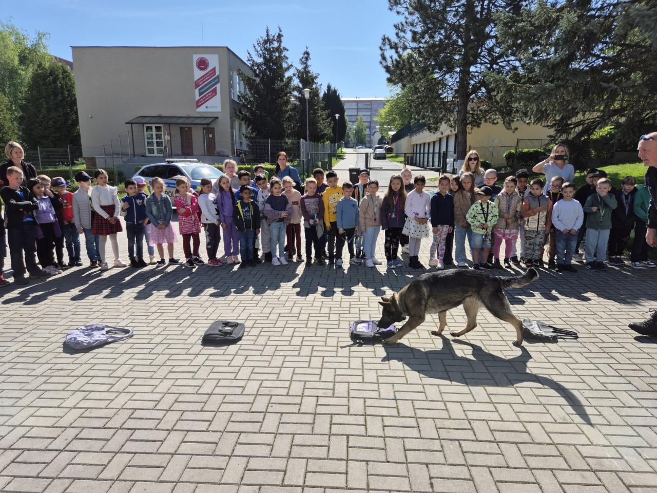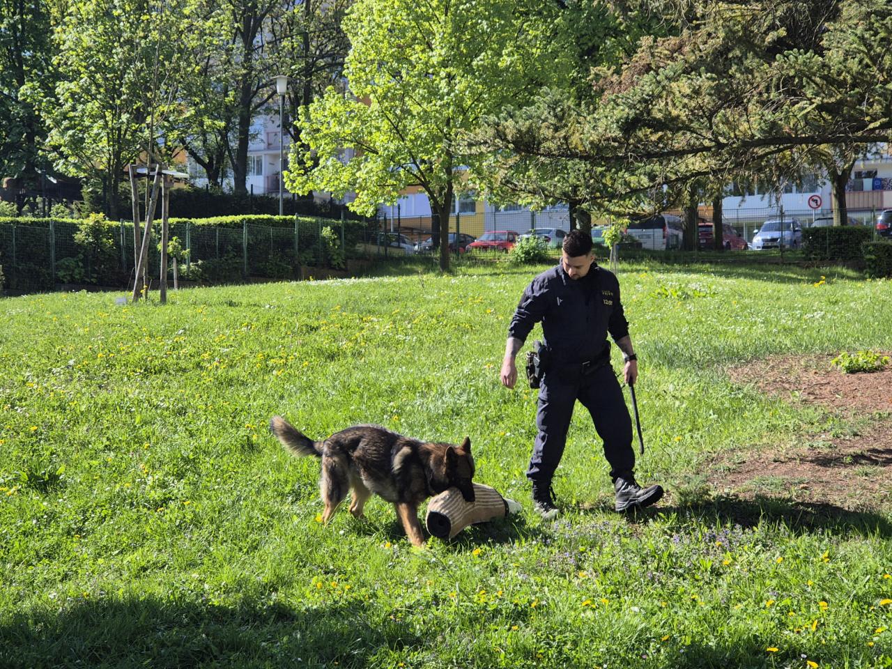 Program zahájili psovodi se svými služebními psy, kteří jsou nedílnou součástí policejní práce. Děti mohly vidět ukázku práce specializovaného psa na vyhledávání výbušnin (tzv. pes pro detekci výbušnin) – ukázal, jak pečlivě dokáže pomocí čichu odhalit nebezpečné látky. Další čtyřnohý pomocník byl pes určený k zadržení pachatele (tzv. služební pes pro obranu a zákrok), který předvedl, jak chrání policisty při zadržování nebezpečných osob.