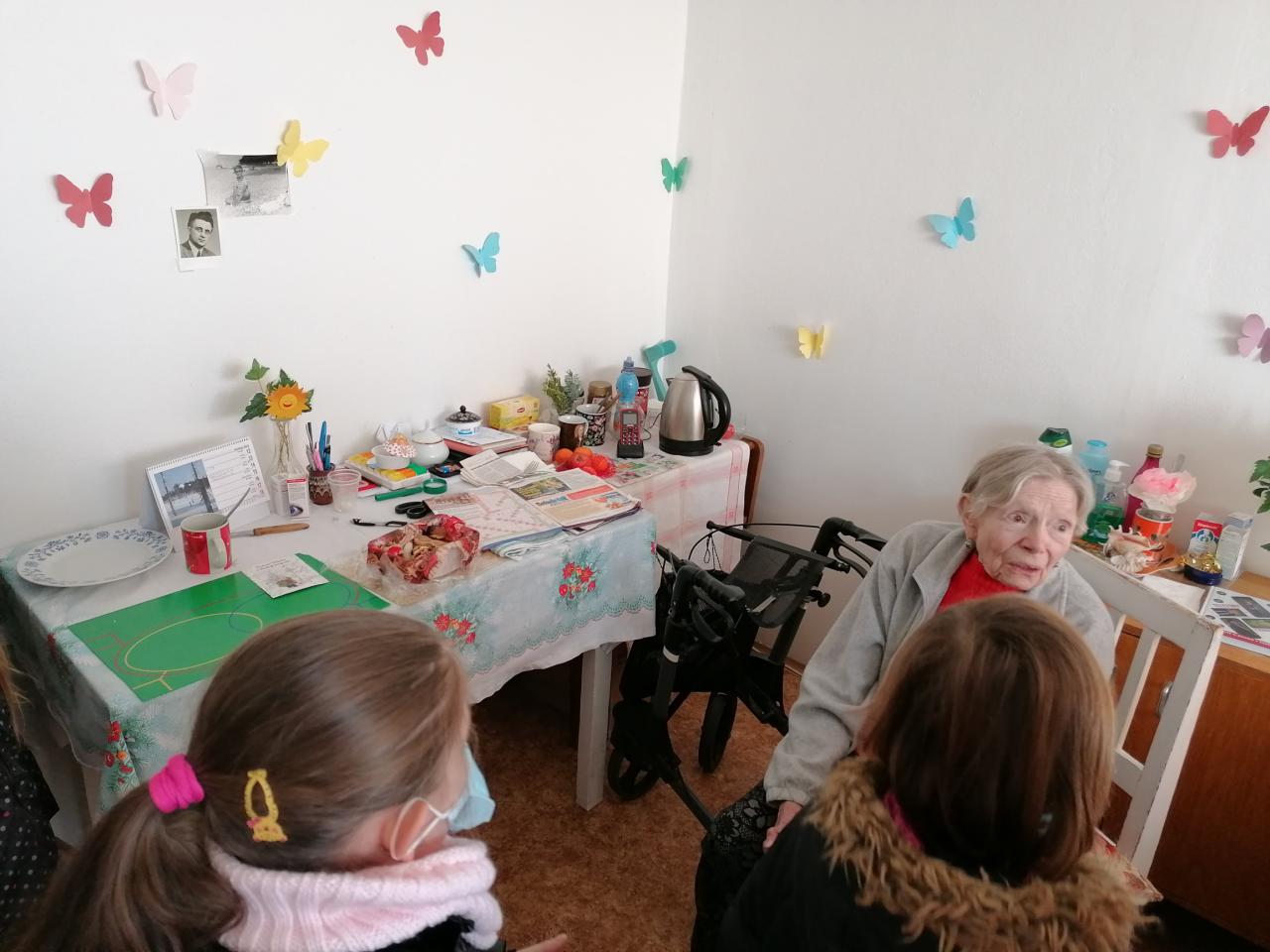 Paní Emilku jsme překvapili, zajímalo nás také pár věcí z jejího života. Moc ji potěšily zarecitované básničky. Zazpívali jsme si společně koledu a děti zahrály na flétničku zimní písničky.