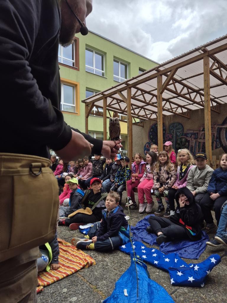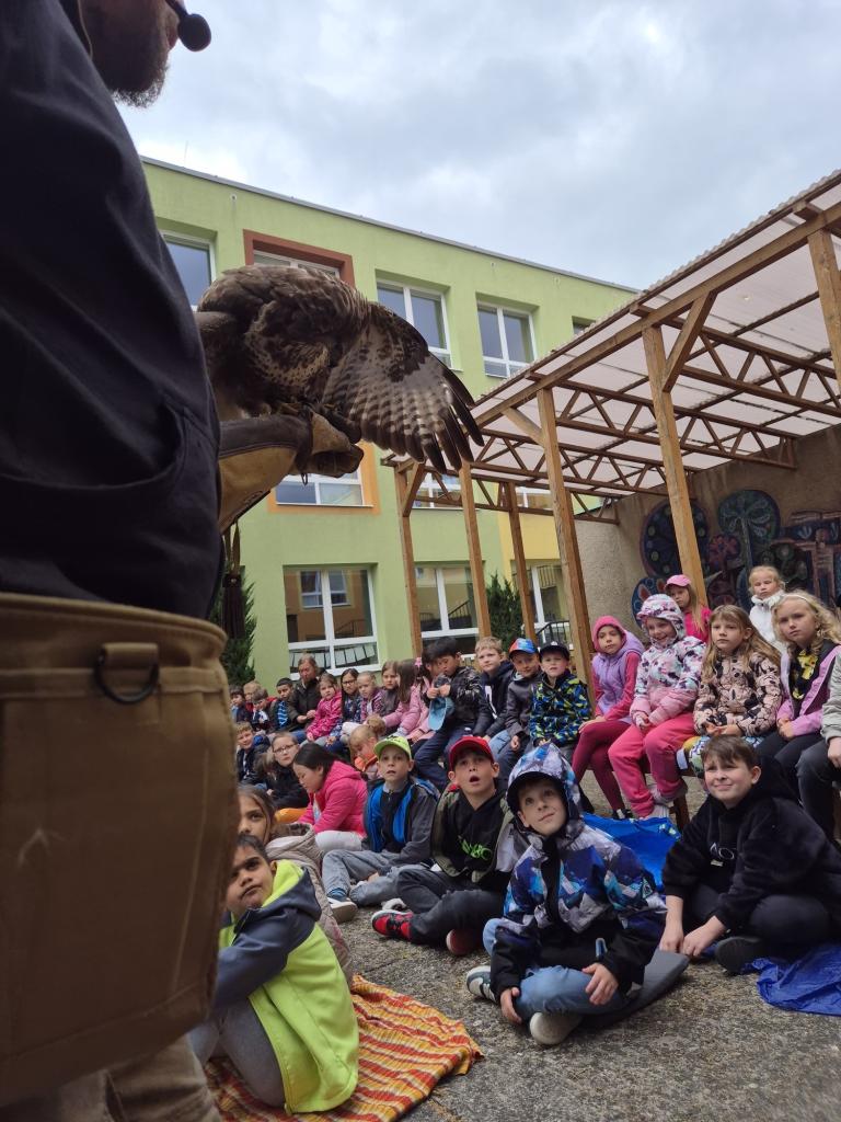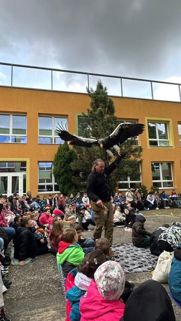 V pondělí odpoledne se školní atrium proměnilo v malé přírodní divadlo. Děti ze školní družiny měly jedinečnou příležitost zúčastnit se poutavého vzdělávacího programu s živými ptáky – sovami a orly. Akce byla připravena ve spolupráci se sokolníkem ze společnosti Pochop přírodu. Ptáci byli představeni poutavou přednáškou, během níž se děti dozvěděly mnoho zajímavostí o životě sov a orlů – kde žijí, čím se živí, jak loví a proč jsou pro přírodu tak důležití. Největší úspěch však sklidila samotná ukázka živých ptáků. Děti si mohly zblízka prohlédnout například orla kamčatského, sovou kulíška či káně lesní a sledovat, jak dravci tiše kloužou vzduchem, reagují na povely sokolníka a vracejí se na jeho ruku.