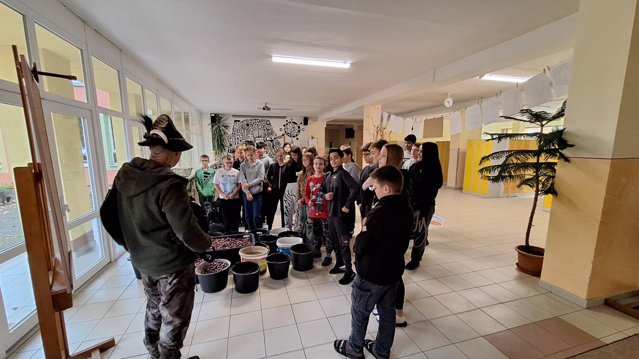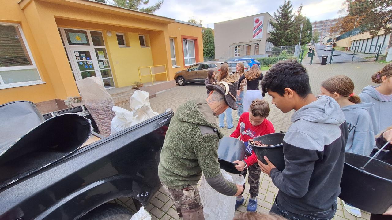 Pan myslivec poděkoval dětem za nasbírání více než 200 kilogramů kaštanů pro zvěř.