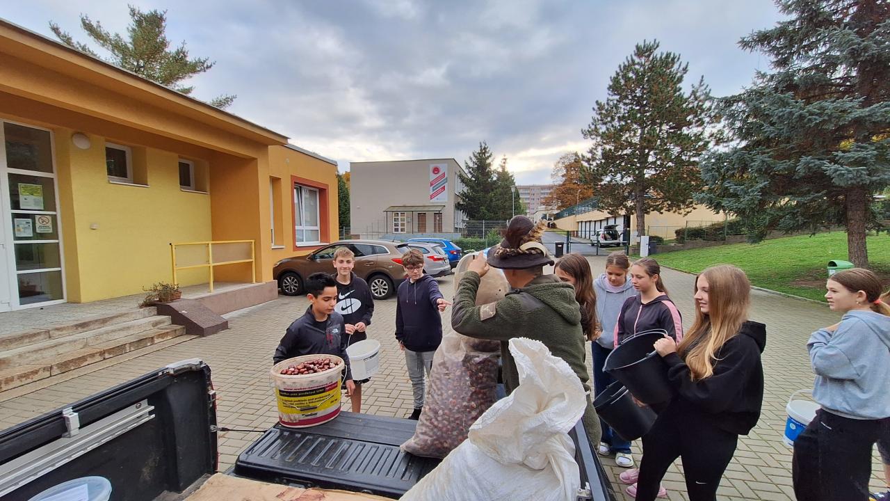 Jírovec maďal neboli kaštan koňský (latinsky Aesculus hippocastanum) je statný opadavý strom s mohutnou korunou, který je chloubou mnoha okrasných zahrad a parků. Může dorůstat až do výšky 30 metrů, má dlanitě složené vícečetné listy a bělavé květy tvořící bohaté laty. V zeleném tobolce s ostny se ukrývají sytě hnědá velká semena – kaštany. A právě takový krásný strom máme kousek pod školou, na sídlišti. Letos měl jeden strom neuvěřitelnou úrodu kaštanů. V rámci předmětu polytechnická výchova jsme se třídami 7.A a 7.B a 7.C vždy 2x kaštany posbírali.  Bylo jich dohromady více než 200 kilo. O kaštany měli totiž zájem myslivci z mosteckého mysliveckého spolku. V zimě totiž kaštany dokrmují vysokou zvěž v okolních lesích. Pan myslivec si v pátek 17.10. přijel a řekl dětem také spoustu zajímavostí o zvířatech v okolí a děti mu pomohly tu ohromnou spoustu nasbíraných kaštanů naložit na auto. Za kaštany byl moc rád a dětem za jejich úsilí několikrát děkovat.