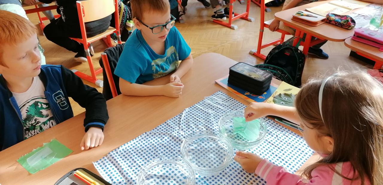 Nejprve jsme si zazpívali písničku o třídění odpadu, zhlédli jsme video o zpracování plastu. Po přípravě materiálu z kufříku jsme se pustili do zkoumání. Během dopoledne jsme pozorovali vlastnosti různých druhů běžně používaných folií. Folie jsme rozpouštěli ve vodě a sledovali, co se s nimi děje. Následně jsme si všechny poznatky jako správní vědci zapsali do pracovních sešitů. Nechyběla ani anglická lekce, při které jsme se učili názvy různých materiálů, které nás obklopují.