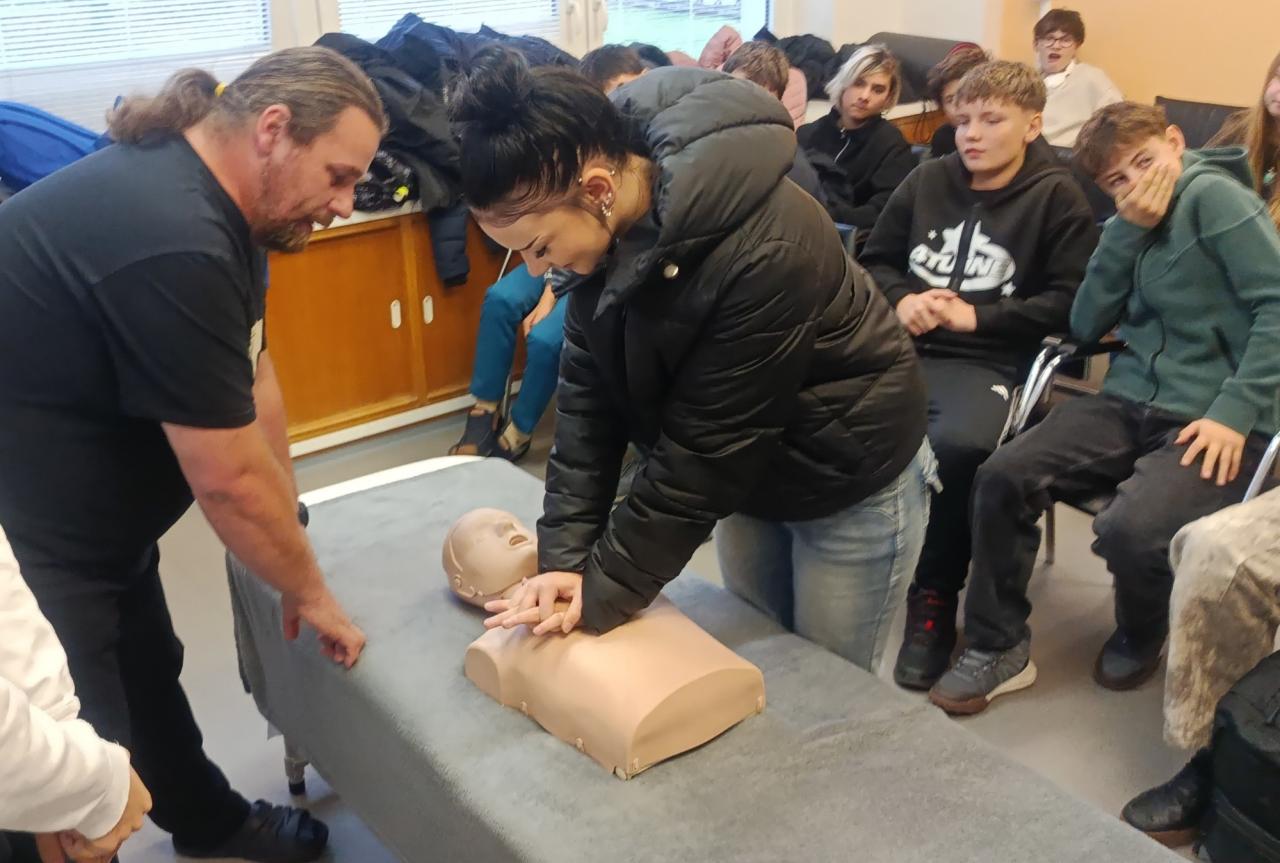Druhá skupina mezitím absolvovala blok zaměřený na základy první pomoci. V úvodu lektor vysvětlil, jak postupovat, když najdeme člověka ležet na zemi bez známek života — jak zjistit, zda je při vědomí, jak ověřit dýchání a jak správně vyhodnotit situaci. Následovala instruktáž o tom, jak správně volat tísňovou linku 155 a jaké informace musí volající operátorovi sdělit. Žáci se dozvěděli i to, proč se u dospělých při laické první pomoci již běžně nepoužívá dýchání z úst do úst, ale pouze stlačování hrudníku. Poté si děti na figuríně, kterou společně pojmenovaly Franta, vyzkoušely praktický nácvik resuscitace pouze pomocí kompresí hrudníku – tedy správné umístění rukou, rytmus stlačování i vhodný postoj při provádění této techniky. Po zhruba tři čtvrtě hodině se skupiny vystřídaly. Krátce před 11. hodinou exkurze skončila. Celá akce byla velmi přínosná, především praktická část věnovaná první pomoci. Žáci odcházeli s novými poznatky a dovednostmi, které mohou jednou pomoci zachránit lidský život.