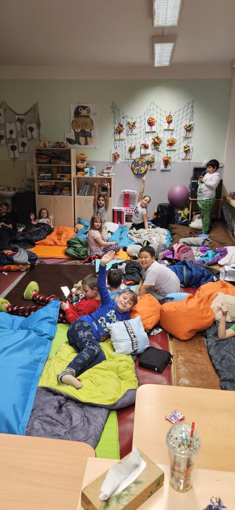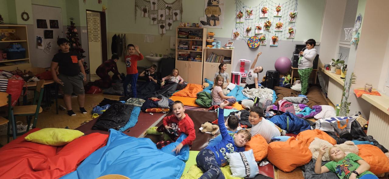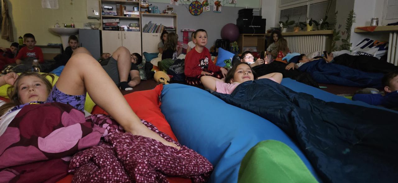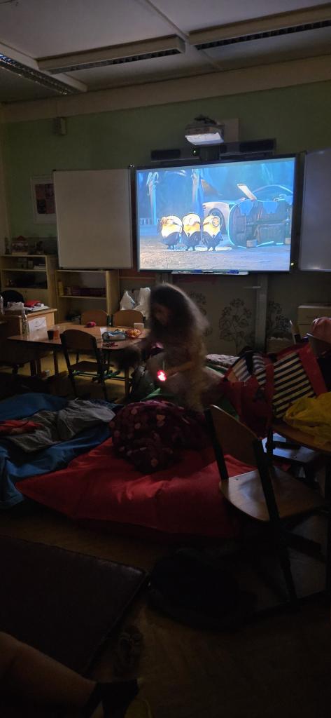 Po večeři přišel na řadu hlavní program večera – promítání pohádky "Já, padouch 4". Děti se pohodlně usadily na připravené polštáře a deky v naší třídě a s nadšením sledovaly oblíbené postavy na velkém plátně. Smích a radostné výkřiky se nesly celou třídou a vytvořily nezapomenutelnou atmosféru. Povídali si o svých zážitcích. Všechny děti se postupně ukládaly ke spánku, plné dojmů z celého večera.