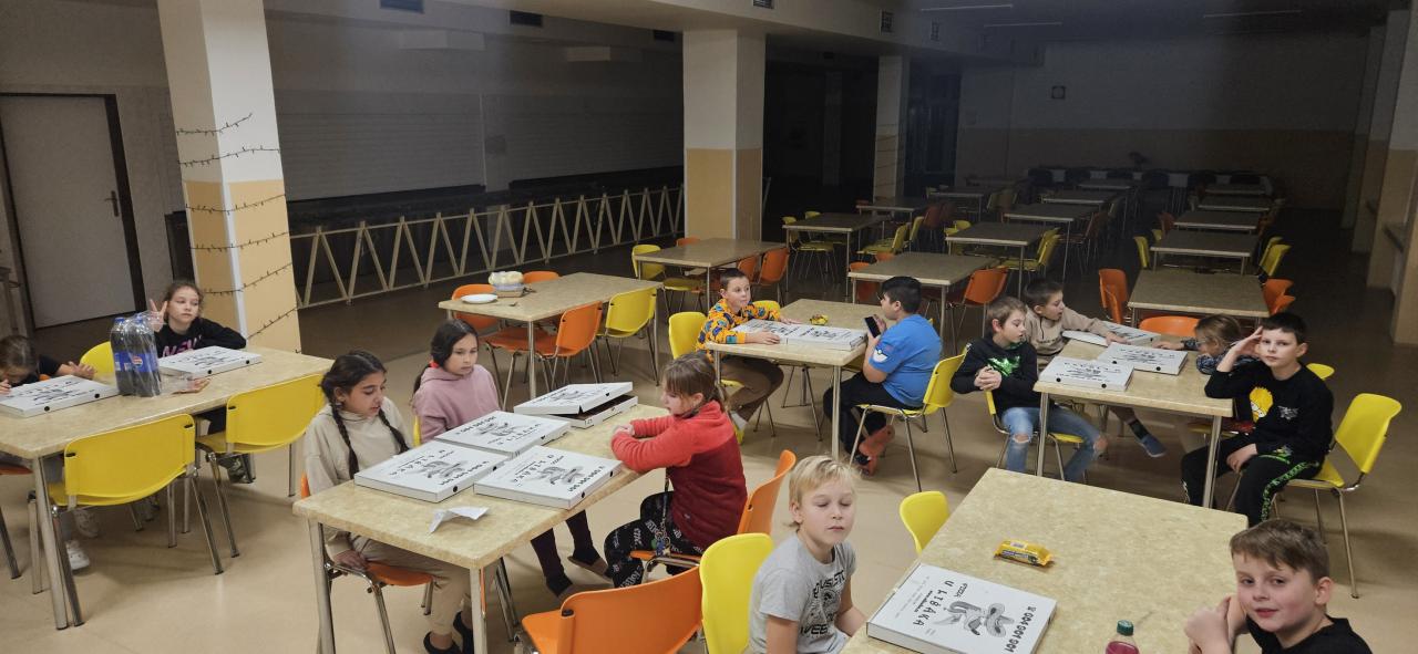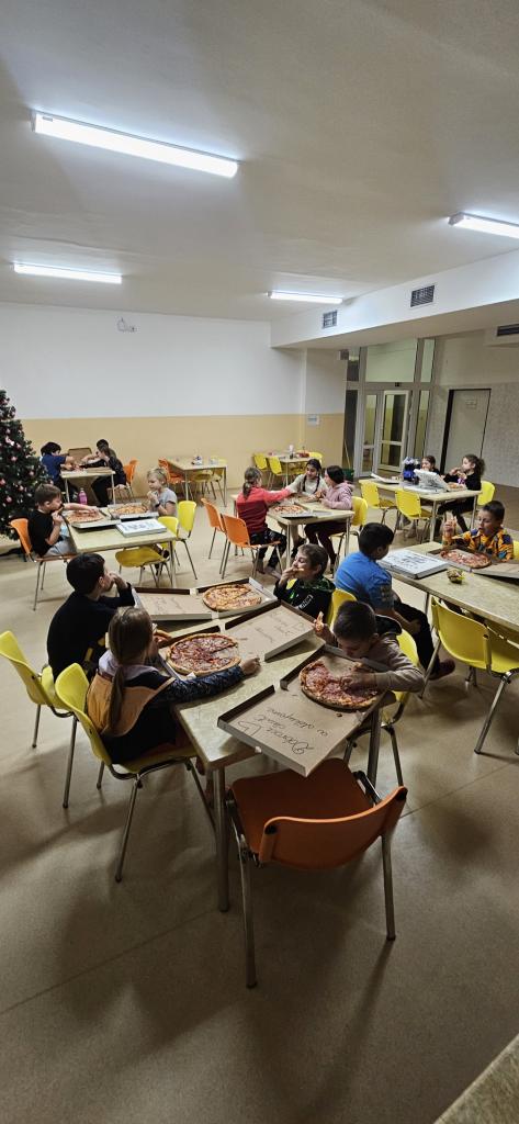 Když dorazila pizza, všichni jsme se sešli v naší školní jídelně, kde jsme si vychutnali lahodné plátky různých druhů pizz. Byla to skvělá příležitost, jak si všichni společně posedět, povídat si a sdílet své zážitky.