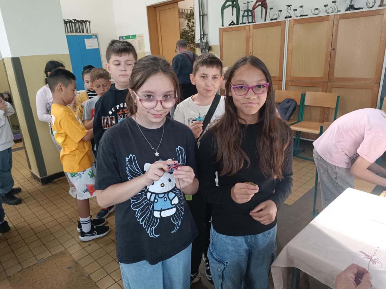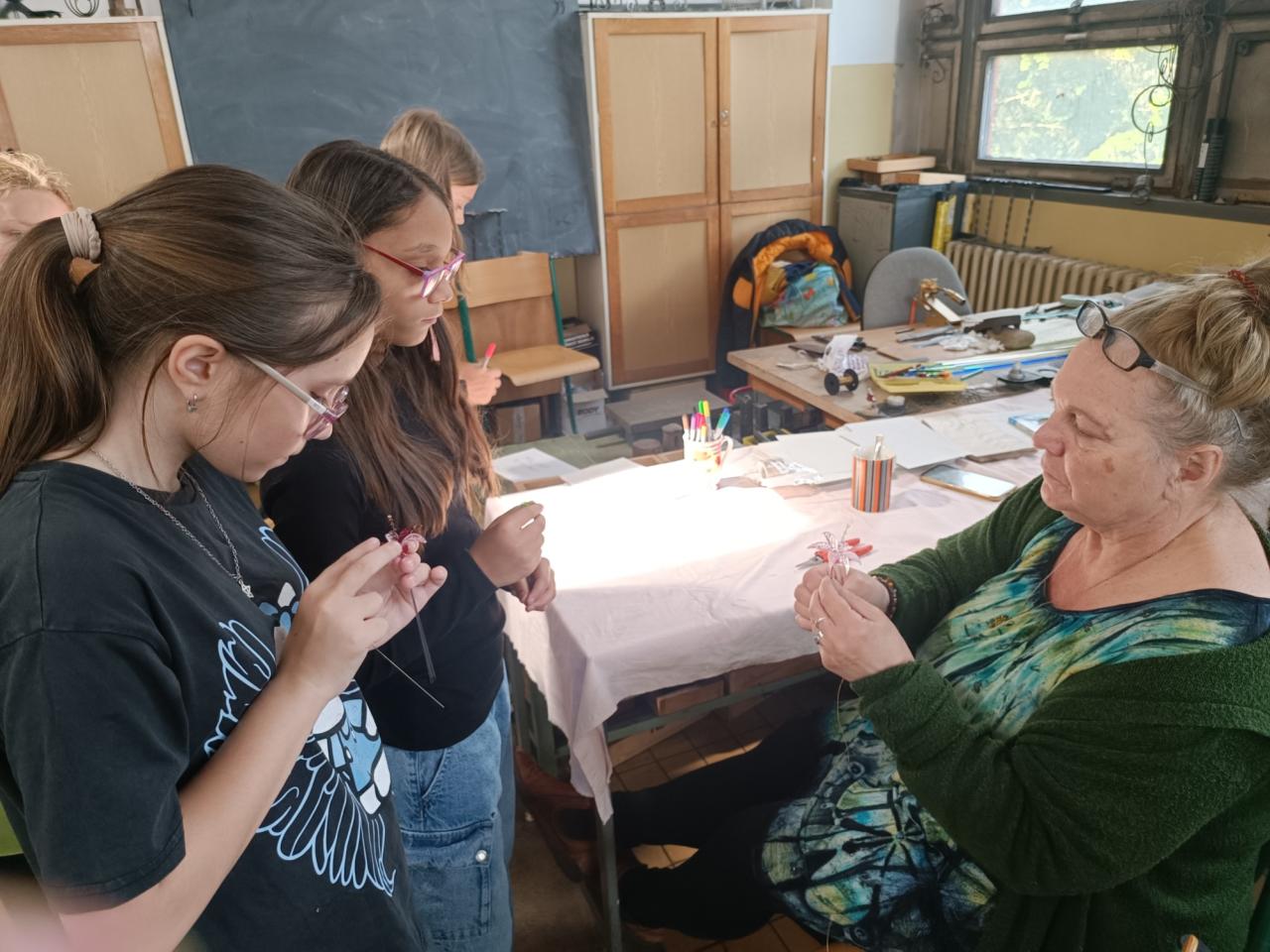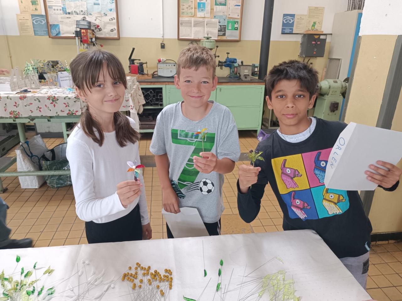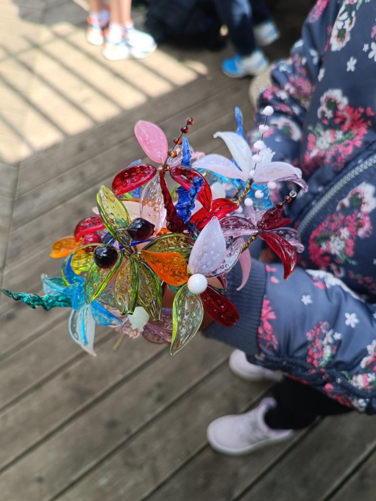 Žáci si sami s nadšením vytvořili z připravených skleněných komponentů překrásné skleněné kytičky a vyzkoušeli si práci s netradičním materiálem. Poté jim paní Růžičková ukázala výrobu skleněných šperků a zvířátek pomocí hořáku a skleněných tyček.