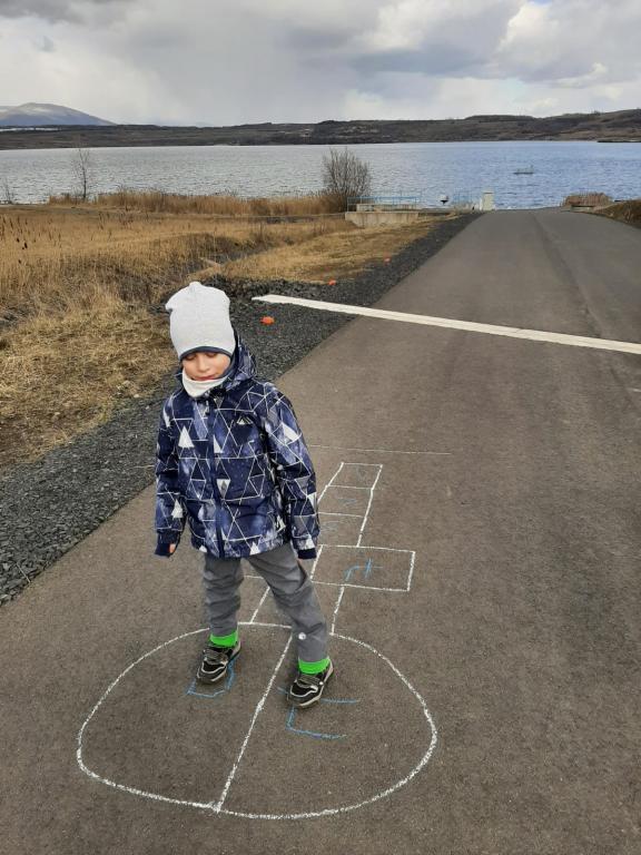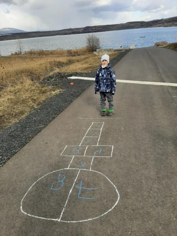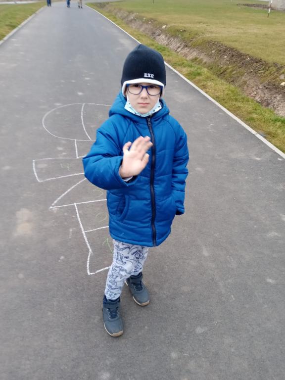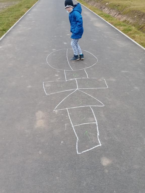 Přípravná třída (paní učitelky Ochtábcové) měla za úkol si nakreslit venku panáka a zaskákat si ho.