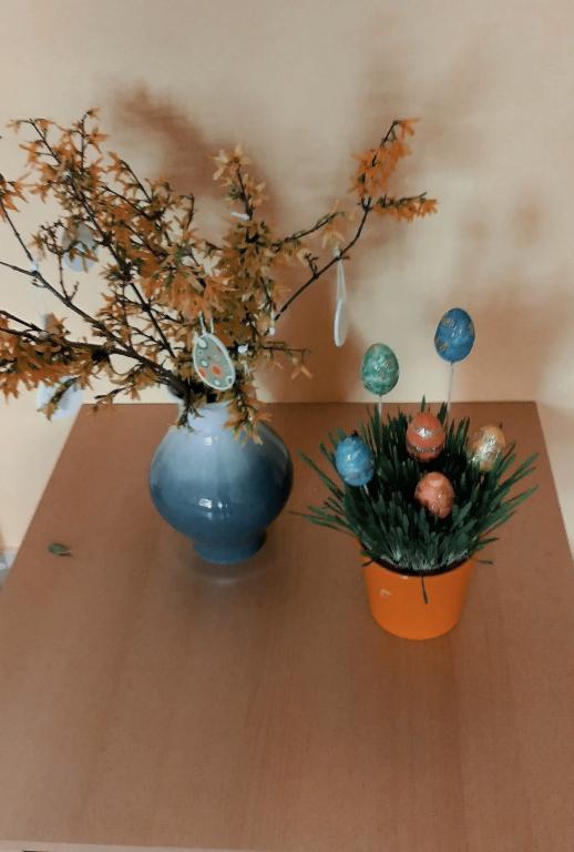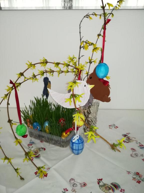 4.C (paní učitelky Kučerové) malovala vajíčka. Žáci připravili kvetoucí větvičku do vázičky a výzdobu stolu na velikonoční svátky.