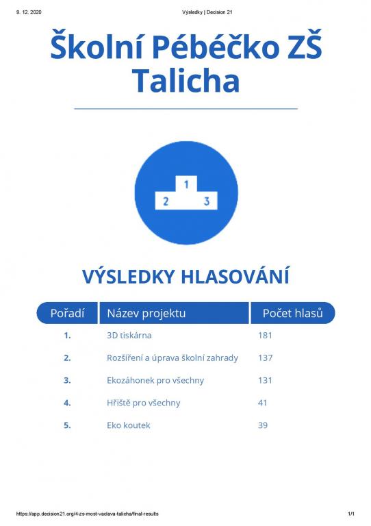 Nejvíce se žákům zamlouval nápad s 3D tiskárnou, který získal nejvíce hlasů. Na druhém místě skončil nápad s Úpravou školní zahrady a arboreta.