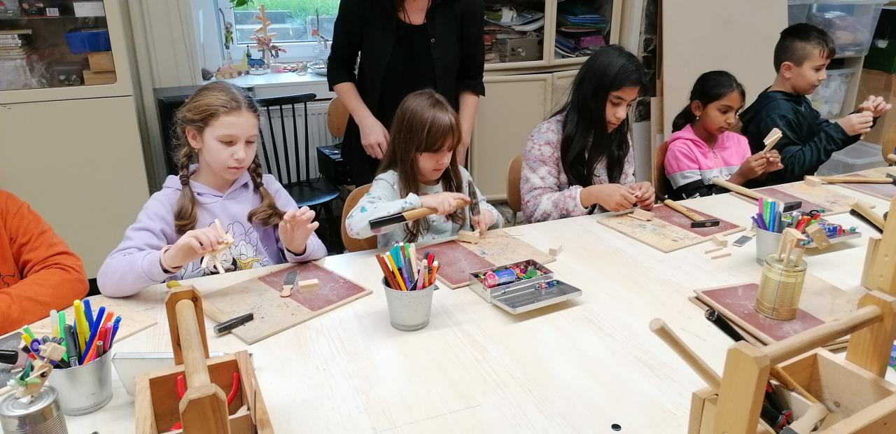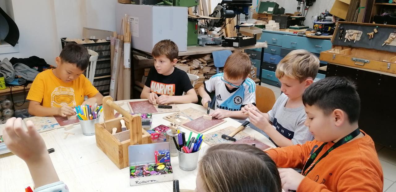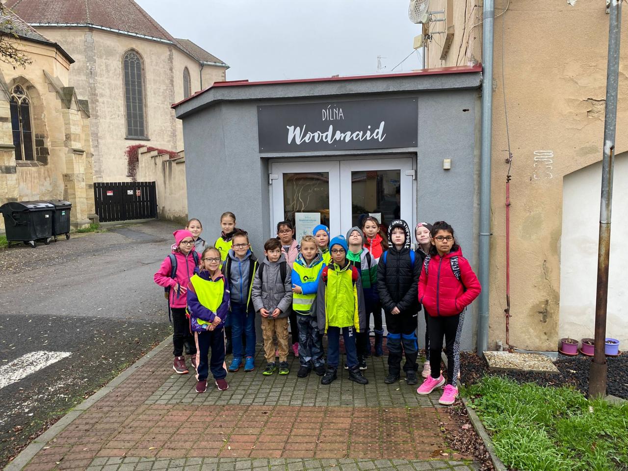 To máte dřevo, pilníky, hřebíky, kladívka, korálky, knoflíky a mnoho dalšího…s tím vším se třeťáci učili pracovat ve školní dílně Woodmaid u gotického kostela. V příjemném pracovním prostředí děti vedla krok za krokem p. Techlovská, aby si na závěr odnesly domů vlastnoruční výrobek Robotek. Ze všech stran se ozývalo ťukání, bouchání, broušení a nadšené štěbetání.